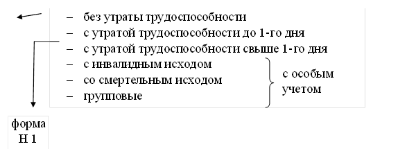К производственны несчастным случаям относятся травмы, полученные на территории предприятия в рабочее время при выполнении производственных обязанностей, на транспорте предприятия, в командировке, на личной транспорте при наличии договоренности и задания организации, на территории предприятия в случае природного ЧС, при острых отравлениях.