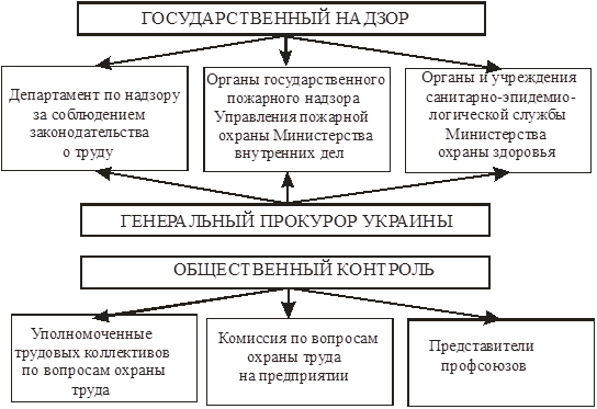 Государственное управление охраной труда в Украине осуществляют Кабинет Министров Украины, Департамент государственного надзора за соблюдением законодательства о труде, министерства и другие центральные органы государственной исполнительной власти, местные государственные администрации, местные Совета.