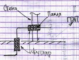 Футляр при пересечении со стеной также полностью затыкается паклей (просмоленной), а концы заливаются битумом.