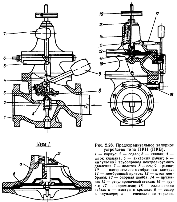 Корпус вентильного типа, чугунный. Внутри корпуса имеется седло, клапан основной, в котором вмонтирован перепускной клапан. Клапаны через вилку связаны с осью. На конце вышедшей из корпуса оси закреплен рычаг с грузом. На выходе оси из корпуса имеется сальниковое уплотнение с сальниковой гранд-буксой. У клапана в нижней части имеется направляющая колонка и направляющий стержень, предназначенные для правильной посадки клапана на седло при срабатывании.