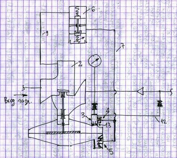 Работа регулятора. При повышении давления за регулятором это повышенное давление по импульсной трубке (12) поступит в импульсную колонку (3), откуда в одном направлении через дроссель (13) поступит в надмембранную полость мембранной камеры исполнительного узла. При этом мембрана прогнется вниз через шток, приблизит клапан к седлу корпуса, уменьшив проход и давление газа потребителю до заданного пилотом значения.