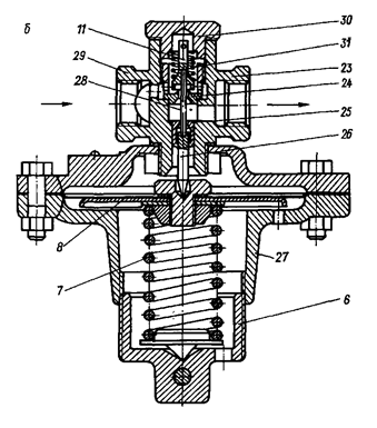 В подмембранной полости (под крышкой пилота) имеется пружина, предназначенная для настройки регулятора на заданное давление. Усилие пружины регулируется резьбовым регулировочным стаканом. Между мембраной пилота и корпусом в верхней части образована мембранная камера, которая через импульсную трубку сообщается с выходным сниженным давлением газа после регулятора.
