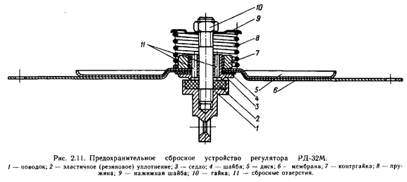 В РД-50 снизу в корпус вмонтировано предохранительно-сбросное устройство мембранного типа. В РД-32 предохранительно-сбросное устройство вмонтировано в цетре мембраны. В некоторых конструкциях регуляторов нет предохранительно-сбросных устройств, они вынесены отдельным узлом.