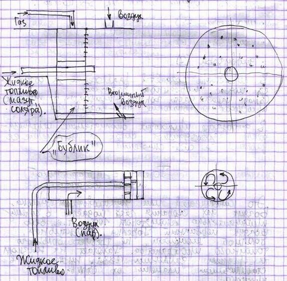 Форсунка представляет собой конструкцию типа труба в трубе. По центральной трубе подается жидкое топливо, по межкольцевому пространству подается распыливающий воздух или пар.