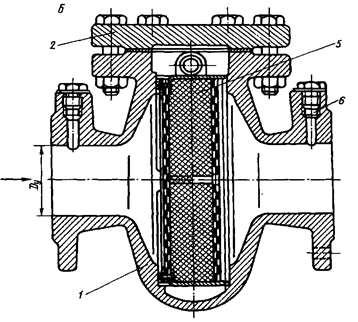 Чугунный фильтр. Он имеет чугунный литой корпус, внутри которого имеется фильтрующая кассета (5). Сверху корпуса имеется крышка (2) на болтах. Фильтр фланцевый. Во фланцах чугунного фильтра имеются резьбовые отверстия, предназначенные для подключения манометров.