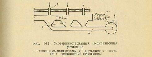 Потоки воздуха в ответвлениях от мест отсоса возникают под действием давления, почти одинакового во всех точках коллектора (давление по длине магистрального трубопровода изменяется в пределах 5—7%).