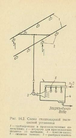 При механизированной очистке оборудования, помещений и строительных конструкций используют промышленные пылесосы и централизованные стационарные пылесосные системы с разводкой вакуумных труб по помещениям (рис. 2). Трубы имеют штуцеры для присоединения шлангов со щетками. Для очистки отсасываемого воздуха от горючих отходов производства и пыли система имеет рукавные или водяные фильтры.