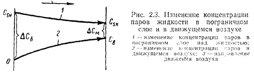 Характер изменения концентрации пара по высоте от поверхности испарения жидкости при движущемся воздухе резко отличается от закономерности изменения концентрации паров при испарении в неподвижный воздух. При конвективной диффузии над поверхностью жидкости образуется небольшой толщины пограничный слой с насыщенной концентрацией паров, затем происходит резкий перепад концентрации и в последующих слоях воздуха, т. е. выше пограничного слоя, вследствие интенсивного перемешивания воздуха при движении концентрация пара будет примерно одинаковой (рис. 2.3).
