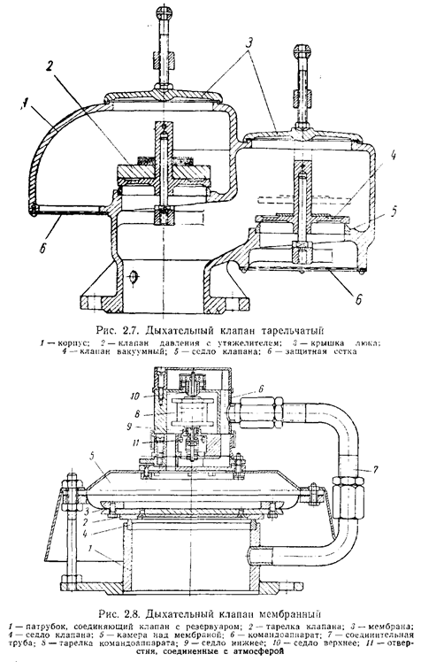 Для создания избыточного давления на дыхательных линиях резервуаров и емкостей устанавливают дыхательные клапаны тарельчатые (рис. 2.7) или мембранные (рис. 2.8). Естественно, что эффективность дыхательных клапанов зависит от величины их рабочего давления.