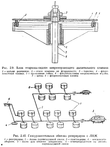 Практика эксплуатации резервуаров показывает, что клапаны низкого давления (от 50 до 200 мм вод. ст.) дают сравнительно небольшой эффект, сокращая потери от испарения примерно на 3—10%. Поэтому в настоящее время проектируются и строятся емкости с рабочим давлением 2000 мм рт. ст. и более.