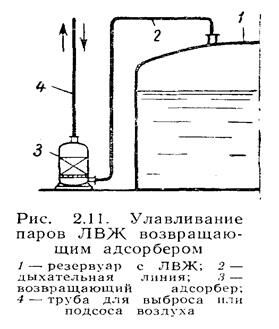 Улавливание паров легковоспламеняющихся жидкостей возвращающими абсорберами или адсорберами. Действие абсорбера или адсорбера (рис. 2.11) основано на поглощении паров жидкости соответствующим абсорбентом или адсорбентом при выходе паровоздушной смеси из резервуара наружу и отдаче их обратно при засасывании атмосферного воздуха в резервуар. Уменьшение потерь при этом не превышает 40%. Могут быть и другие варианты улавливания паров, выходящих из резервуаров и емкостей при дыхании.