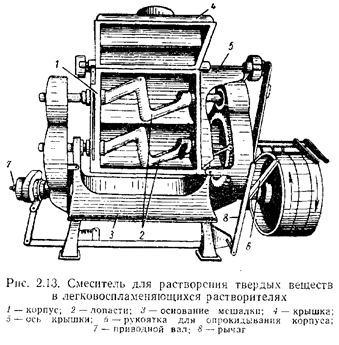 В этом отношении показателен смеситель (рис. 2.13) для приготовления резинового клея (раствор каучука в бензине «калоша») или целлулоидной массы (раствор нитроклетчатки и камфоры в ацетоне) с температурным режимом работы около 30°С и рабочим давлением 1,1—1,2 ата. В процессе растворения концентрация паров растворителя в аппарате будет выше верхнего предела воспламенения, так как рабочая температура значительно выше верхнего температурного предела воспламенения бензина и ацетона. Разгрузка готовой массы производится опрокидыванием аппарата при открытой крышке. Открывание крышки смесителя приведет к выходу паров ЛВЖ наружу, образованию местных пожароопасных концентраций вблизи аппарата, а также и внутри аппарата при поступлении в него воздуха.
