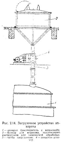 Загрузка растворителей твердым веществом в некоторых случаях производится постепенно в течение длительного времени. При этом аппарат (рис. 2.14) загрузочной трубой соединен с бункером, находящимся в другом помещении. Растворитель подается в аппарат в несколько приемов. Пары огнеопасной жидкости, вытесняемые при загрузке такого аппарата, могут попадать в бункер и из него в помещение, создавая опасность взрыва.