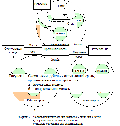 Пример 4. Декомпозиция на базе источников, стоков и потоков объектов. При этом в качестве объектов могут рассматриваться деньги, материалы, люди, загрязняющие вещества, энергия и т.д.  На рисунке 4 показана модель взаимодействия окружающей среды, промышленности и потребителя на основе формальной модели « источник – поток – сток ». Подобные модели, как правило, используются при составлении уравнений материального баланса.