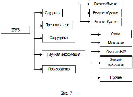 Неэлементарный фрагмент подлежит дальнейшей декомпозиции. Возможно также введение новых элементов в модель-основание и продолжение декомпозиции по ним.  Примером может служить рассмотрение  системы «вуз» (см. рис.7). Здесь выход «студенты» можно разделить на студентов дневного, вечернего и заочного обучения, выход «научная информация» - на выходы «монографии», «статьи», «отчеты по НИР», «заявки на изобретения и т.п. На определенной стадии можно рекомендовать  выделить из «прочего» и включить в число существенных еще один элемент. Таким образом  мы получаем новые основания для его декомпозиции, а значит, и возможность продолжить анализ.