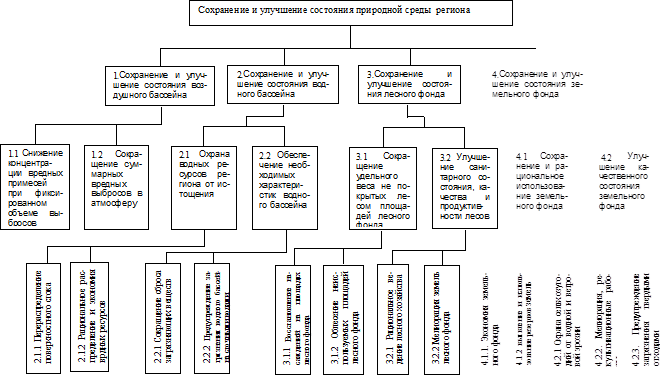 Конечная цель разбивается на 4 функциональных подцели первого уровня. Расчленение подцелей с индексами 1-4 приводит к формированию 2-го уровня дерева целей на примере куста, отражающего проблемы водоохранной деятельности в регионе.