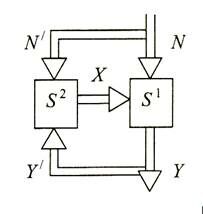 Здесь S1 — объект управления, S2 — управляющая си стема, М — информация о со стоянии внешней среды (вне шние воздействия на объект управления), К — информация о состоянии внешней среды, имеющаяся в управляющей системе, Х — командная информация системы с управлением информация, У — информация о состоянии объекта управления, У’ — информация о состоянии объекта управления, имеющаяся в управляющей системе.
