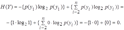2. Идеальное управление. Если управление идеальное, управляемый объект будет все время находиться в заданном состоянии с вероятностью, равной единице, и поэтому энтропия управляемого объекта равна нулю. Действительно, пусть для заданной системы при условии воздействий Х вероятность первого состояния p(y1) = 1, а вероятности остальных состояний