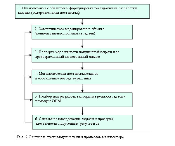 Объективная сложность процессов в техносфере делает невозможным их изучения с помощью моделей какого-либо одного типа. Моделирование таких процессов предполагает их представление в виде системы взаимодействующих разнородных компонентов. Таким образом, модель таких процессов может содержать в себе несколько разнородных субмоделей. Это накладывает свой отпечаток и на само моделирование, который удобно представить в виде определенных этапов, на которых проявляются особенности процессов в человеко-машинных системах (ЧМС)[1]. Основные этапы моделирования техносферных процессов представлены на рис. 5.