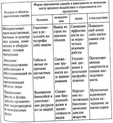 В табл. 2 систематизированы некоторые формы проявления прямого ущерба (ее правая часть) применительно к различным видам ресурсов (левая часть). При этом интенсивность или доза вредного воздействия указанных выше поражающих факторов снижается по мере рассмотрения столбцов правой части слева направо, тогда как степень отдаленности последствий ухудшения повреждаемых объектов растет в этом же направлении. Что касается градации интенсивности и отдаленности, то она — двухступенчатая: «большая» — «малая» и «немедленно» — «впоследствии» соответственно.