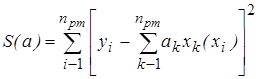 Минимум этого выражения достигается при равенстве нулю его производной по параметрам. Заменив линейную модель этой функцией, возьмем первые производные и приравняем их к нулю. В результате получим уравнения, которые могут быть решены относительно параметров ak.