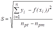 где f(xi) - значения, рассчитанные по модели регрессии, yi - точки данных, и n - число параметров в конкретной модели (так, чтобы знаменатель соответствовал числу степеней свободы). Стандартная ошибка определяет разброс точек данных вокруг кривой регрессии. По мере улучшения качества модели стандартная ошибка приближается к нулю.