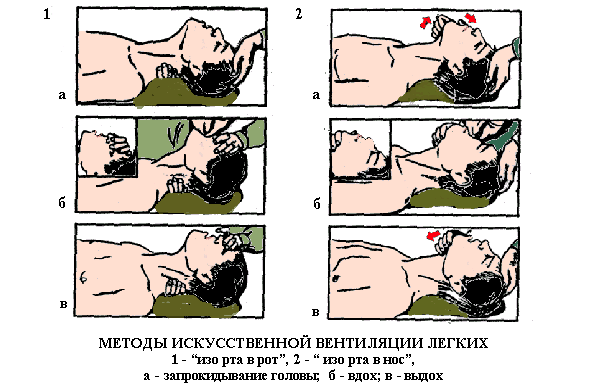 пострадавшего укладывают на спину и становятся на колени сбоку у его головы; восстанавливают проходимость дыхательных путей; сделав глубокий вдох и зажав нос пострадавшего пальцами, лежащей на лбу руки, охватывают своими губами область раскрытого рта и вдувают воздух в дыхательные пути пострадавшего, наблюдая за движением грудной клетки. При утечке воздуха через нос или углы рта передняя стенка грудной клетки или не движется, или смещается кверху незначительно; отводят свое лицо в сторону, продолжая удерживать голову пострадавшего в запрокинутом состоянии. При этом за счет эластичности мышц грудной клетки пострадавшего происходит пассивный выдох.