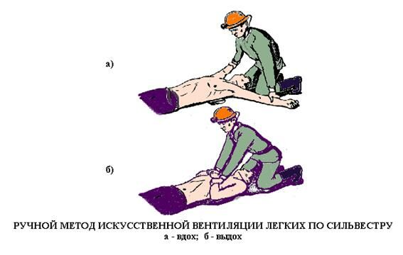 Для быстрого восстановления дыхания используют методы ИВЛ с активным вдуванием (“изо рта в рот”, “ изо рта в нос”, через S- образный воздуховод), что позволяет вводить в легкие пострадавшего в среднем 800-1000 мл воздуха, который по содержанию кислорода (16-18%) вполне пригоден для ИВЛ в ситуациях “высшей срочности”. Ручные методы ИВЛ, наиболее эффективным из которых является метод Сильвестра, могут быть использованы как исключение.