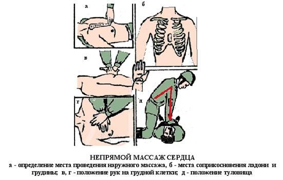 Сочетание непрямого массажа сердца с искусственной вентиляцией легких. Следует помнить, что массаж сердца может быть эффективным только при насыщении крови кислородом. Поэтому его проводят одновременно и ИВЛ.