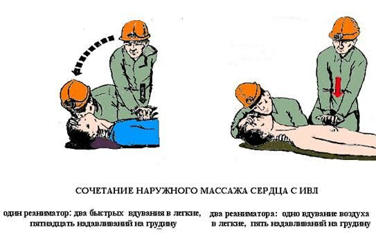Лучше проводить реанимацию вдвоем. При этом один из реаниматоров обеспечивает проходимость дыхательных путей и после раздувания легких приступает к проведению ИВЛ. Второй реаниматор, убедившись в отсутствии пульсации на сонной артерии, освобождает грудную клетку от одежды, расстегивает пояс и после 3-5 быстрых вдувания в легкие, произведенных первым реаниматором, начинает непрерывный наружный массаж сердца с частотой 60 надавливаний на грудину в минуту.