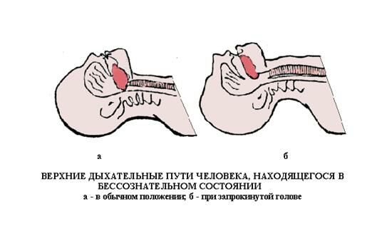 Остановка дыхания у пострадавшего в бессознательном состоянии обычно бывает вызвана закупоркой дыхательных путей корнем языка (особенно при наклоне головы вперед) или инородными телами (пыль, рвотные массы, кровь и др.).