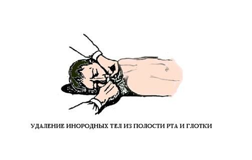 При наличии во рту инородного содержимого голову пострадавшего поворачивают в сторону, открывают рот и одним или двумя пальцами обернутыми тканью, очищают рот и глотку (Рис. 42).