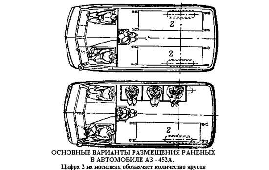 при размещении пораженных лежа и сидя носилки располагаются в передней части автомобиля, а сидячие места оборудуются у заднего борта;