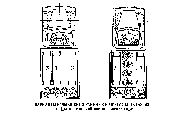 Существуют три основных варианта размещения раненых в автомобиле (Рис. 50): на носилках – 4, сидя – 2; на носилках – 2, сидя – 5; только сидя – 7.