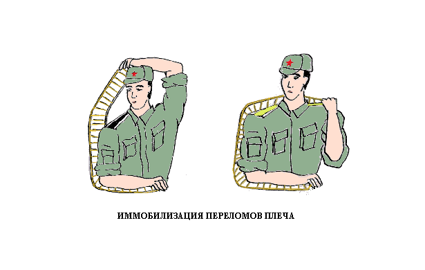 Все виды переломов необходимо непосредственно на месте несчастного случая иммобилизировать с помощью транспортных шин или подручными средствами (доска, рейка, пучки хвороста и др.). Наиболее удобны в пользовании гибкие шины Крамера.