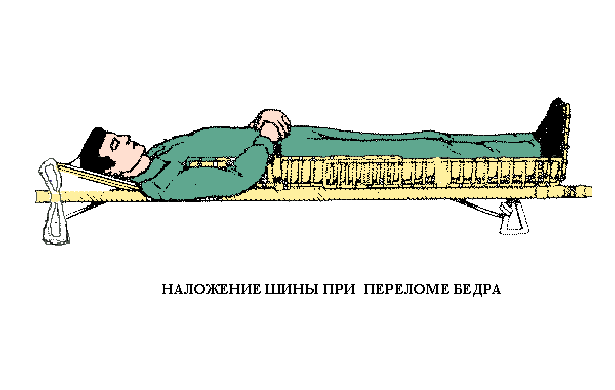 шина должна фиксировать не менее двух суставов, а при переломе бедра - все суставы нижней конечности;