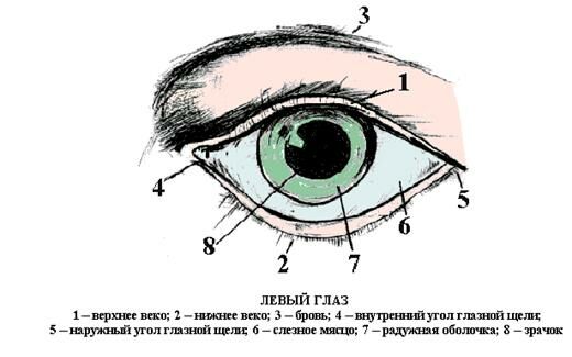 Спереди глазное яблоко защищено верхним и нижнем веками, образующими глазную щель. При малейшей опасности для глаза веки быстро смыкаются. Глазная щель при этом полностью закрывается. Скользя по глазу при мигательных движениях, веки равномерно распределяют слезу и поддерживают необходимую влажность роговой и слизистой оболочек и, кроме того, удаляют с поверхности глаза мелкие инородные тела.