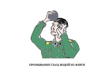 Промывание глаз (Рис. 37) производят немедленно после ожога и по возможности обильным количеством жидкости, но не сильной струей. При отсутствии нейтрализатора глаза можно промывать водой из крана-гидранта, водопроводного крана, бачка, бутыли, фляги и др. Промывание должно быть длительным, не менее 10-15 минут. Его нужно производить осторожно, без давления на глаз при хорошо раскрытых веках и приведении глазного яблока в различных направлениях. После промывания пострадавшего направляют в медицинский пункт. При подозрении на ранение глазного яблока промывание глаза производить запрещается.