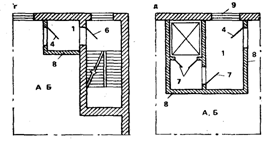 1- тамбур-шлюз; 2 - противопожарная стена 1-го или 2-го типов, противопожарная перегородка 1-го типа, 3 - противопожарная стена 1-го типа; 4 - противопожарная дверь 2-го типа; 5 - противопожарная дверь 1-го типа; 6 - деревянные двери без пустот толщиной не менее 4 см; 7 - двери из негорючих материалов; 8 - противопожарные перегородки 1-го типа; 9 - противопожарные окна 2-го типа.
