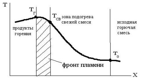 Фронт пламени, т.е. зона, в которой происходит реакция горения и ин-тенсивный саморазогрев сгорающего газа, начинается при температуре само-воспламенения Тсв и заканчивается при температуре Тг.