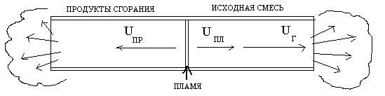 Если рассматривать неподвижную горючую смесь, то при распростра-нении фронта пламени резко нагретые газы не успевают расширяться, и в зо-не горения резко повышается давление, которое «распирает» и выталкивает газы в обе стороны от пламени, причем выталкиваются не только продукты горения, но и возникает движение исходной смеси впереди фронта пламени, как на рисунке 29: