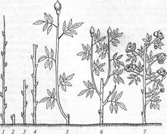 Рис. Обрезка садовых роз: / — побег до обрезки; 2 — сильная обрезка; 3 — средняя обрезка; 4 — слабая обрезка; растение после сильной (5), средней (6) и слабой (7) обрезки