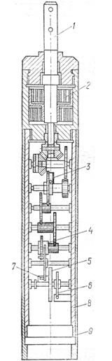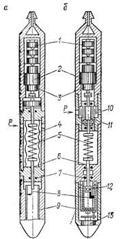 Рис. 10.4 Схемы манометров с вращающимся поршнем | Под влиянием скважинного давления р поршень 6 (рис. 10.4, а), уплотненный резиновым кольцом 7, деформирует винтовую цилиндрическую пружину 5 и перемещается на ход, пропорциональный измеренному давлению. Перемещение поршня регистрируется пишущим пером 8 на бланке, вставленном в барабан 9. Внутренняя полость маноблока, где размещена винтовая пружина, заполнена жидкостью и предохраняется от загрязнения разделителем 4. В конце хода поршень садится на упор во избежание поломки пружины при дальнейшем повышении давления. Для уменьшения трения в уплотнении поршня ему придается вращательное движение. В манометре МПМ-4 поршень жестко соединен с пишущим пером, а бланк установлен в неподвижном барабане. Вращение осуществляется с помощью электродвигателя 2, питаемого от батареи сухих элементов 1. Пишущее перо во время движения поршня чертит на диаграммном бланке винтовую линию. Для получения четкой картины изменения давления частота вращения поршня уменьшается с помощью понижающего редуктора 3. Такое же медленное вращение поршня можно обеспечить, если вместо электродвигателя с редуктором применить усиленный часовой привод. |