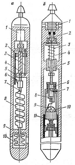 Манометр МГИ-1М предназначен для работы в трубных испытателях пластов. Регистрация изменения давления начинается только после того, как испытательный инструмент спущен на заданную глубину. Для включения часового привода применяется гидровключатель (рис. 10.2, б), состоящий из сильфона 1, уплотненного поршня 2 и подпружиненного штока 4 с нанесенными на нем делениями. Изменение начального натяга пружины 3 производится с помощью гайки 5.