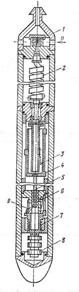 При спуске прибора в скважину клапан 6 открывается, когда забойное давление станет несколько большим давления сжатого газа. После открытия клапана прибор начинает регистрировать изменение забойного давления (разность между давлениями в скважине и давлением сжатого газа). При подъеме прибора клапан 6 закрывается и сжатый газ остается в полости преобразователя.