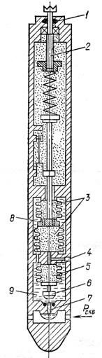Конструктивно прибор отличается от манометра «Байкал-1» наличием узла клапана, служащего для предотвращения поломки сильфонов при заполнении его сжатым газом. Преобразователь давления (рис. 10.6) через иглу 4 предварительно заполняется сжатым газом под давлением, примерно равным забойному давлению в скважине. Под действием этого давления сильфон 5 с клапаном 6 закрывает входное отверстие 7, отсекая жидкость, заполняющую камеры 8 и 9. Давление сжатого газа через сильфоны 3 передается находящейся в замкнутом объеме несжимаемой жидкости, что предохраняет эти сильфоны от разрушения. Ходовой винт 2 уплотнен сальником 1.