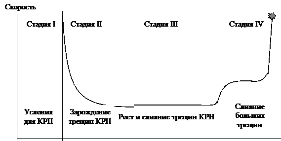 Независимо от наблюдаемой формы развитие трещин КРН происходит в несколько последовательно сменяемых друг друга этапов: инкубационный период зарождения колоний микротрещин; период подрастания микротрещин, их слияние (коалесценция), и образование макротрещин; период медленного развития трещин в колониях, иногда с постоянной скоростью в течение длительного времени; слияние расположенных на одной линии трещин в магистральную и ее нестабильный рост, когда в зоне очага магистральной трещины наступает потеря пластической устойчивости материала трубы.