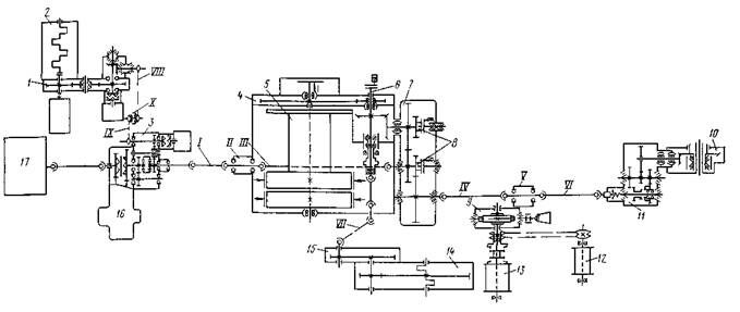 1 - редуктор вспомогательного привода; 2 — вспомогательный привод; 3 — коробка отбора мощности; 4 — лебедка; 5 - вал барабанный; 6 - трансмиссионный вал; 7 — раздаточная коробка; 8 — электромагнитная муфта; 9— редуктор; 10 —ротор; 11 — коробка привода ротора; 12 —катушка: 13 — барабан выдвижения вышки; 14 — насос; 15 — редуктор; 16 — раздаточная коробка транспортера; 17 — гидротрансформатор, /, III, IV, VI, VIII— карданные валы; II, V, X —опоры; VII, VIII, I X — цепные передачи