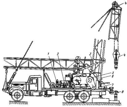 1 — компрессор; 2 — трансмиссия; 3 — гидроподъемник; 4 — талевая система; 5 — двухбарабанная лебедка; 6 — вышка; 7 — пульт; 8 — ротор