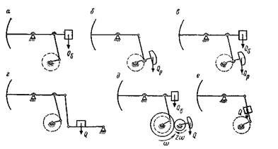 а — балансирное уравновешивание; б — кривошипное (роторное) уравновешивание; в — комбинированное уравновешивание; г — уравновешивание с помощью ложной качалки; д —уравновешивание противовесом, вращающимся с двойной частотой; е —шатунное уравновешивание